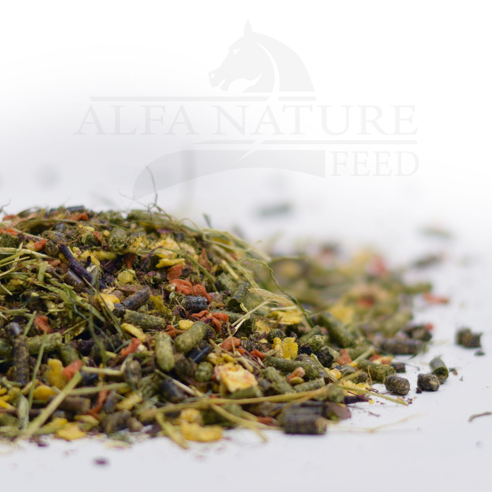 Sieczka z lucerny, Mikronizowane płatki pszenne, jęczmienne i kukurydziane, granulki zbożowe z dodatkiem witamin, pellet z lucerny, otręby jęczmienne, complex vitamin, drożdże sacharomytes cerevisiae chelatowane selenem, otręby ryżowe, fosforan jednowapniowy, tlenek magnezu, suszone owoce z jabłek i porzeczki, suszona marchew, aromat naturalny.